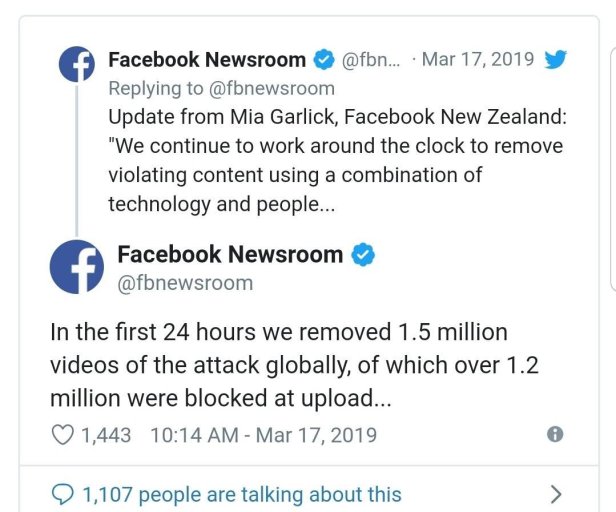 After facebook removal of video which is good measure , TechCrunch was able to find found copies after more than 12 hours after the incident which is not so great. https://techcrunch.com/2019/03/17/facebook-new-zealand/