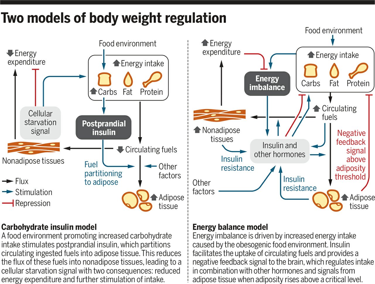 Carbohydrate-insulin” model (CIM), which suggests that body-fat gain results from consumption of carbohydrates that stimulate postprandial insulin, which promotes energy storage and further intake in a vicious cycle.